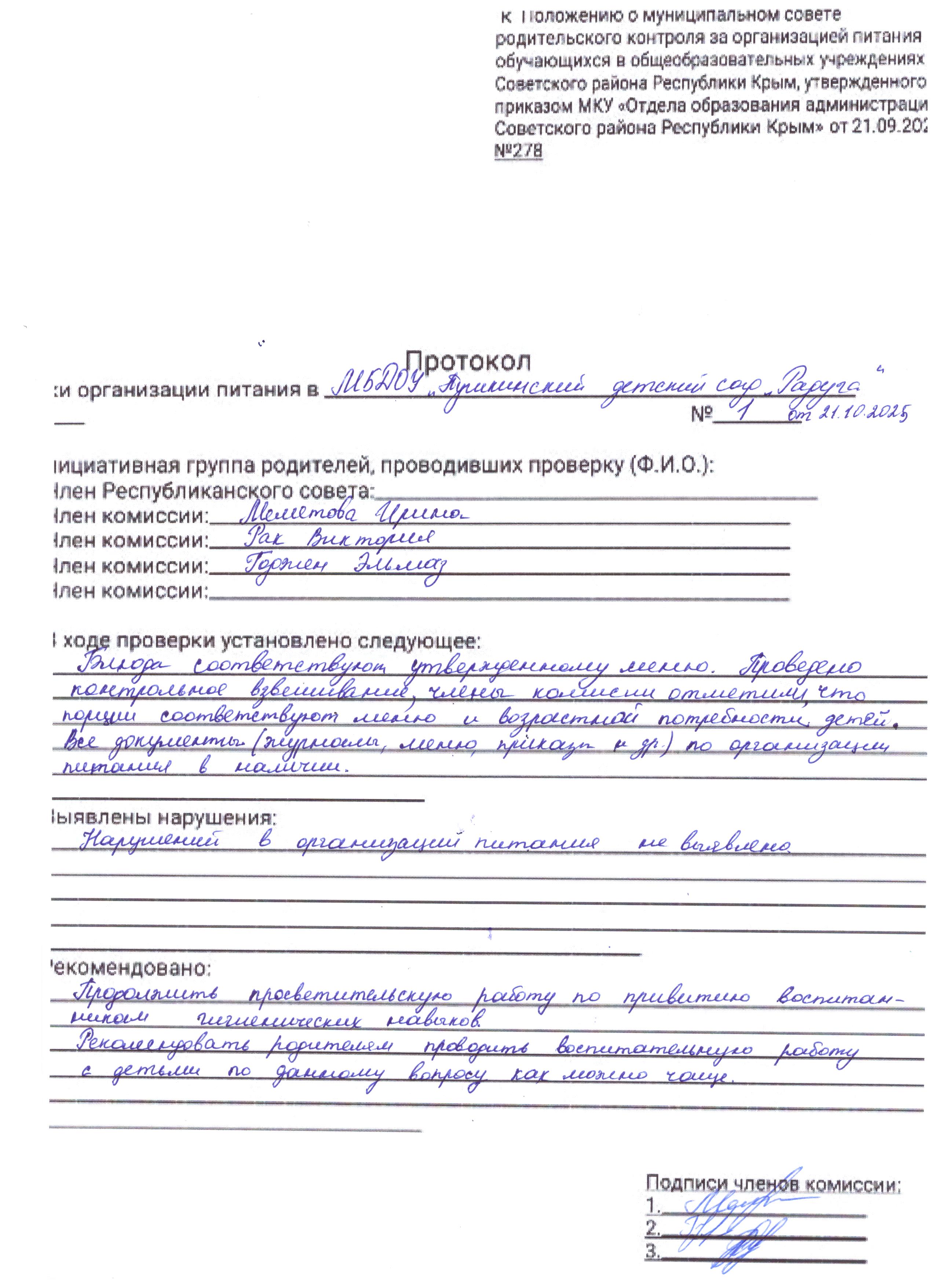 Для осуществления контроля организации питания детей, качества доставляемых продуктов и соблюдения санитарно-гигиенических требований при приготовлении и раздаче пищи в учреждении создана бракеражная комиссия. Выдача готовой пищи разрешается только после проведения контроля бракеражной комиссией в составе не менее 3-х человек. Результаты контроля регистрируются в журнале бракеража готовой кулинарной продукции. В соответствии с графиком бракеражная комиссия и снимает пробу готовых блюд.
