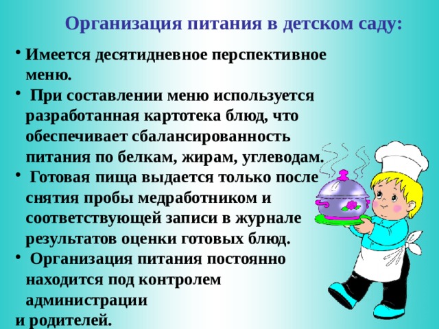 Ежедневно повар готовит свежие и неповторяющиеся блюда. Перед подачей блюд снимает пробу не только повар, но и заведующий, и медсестра.