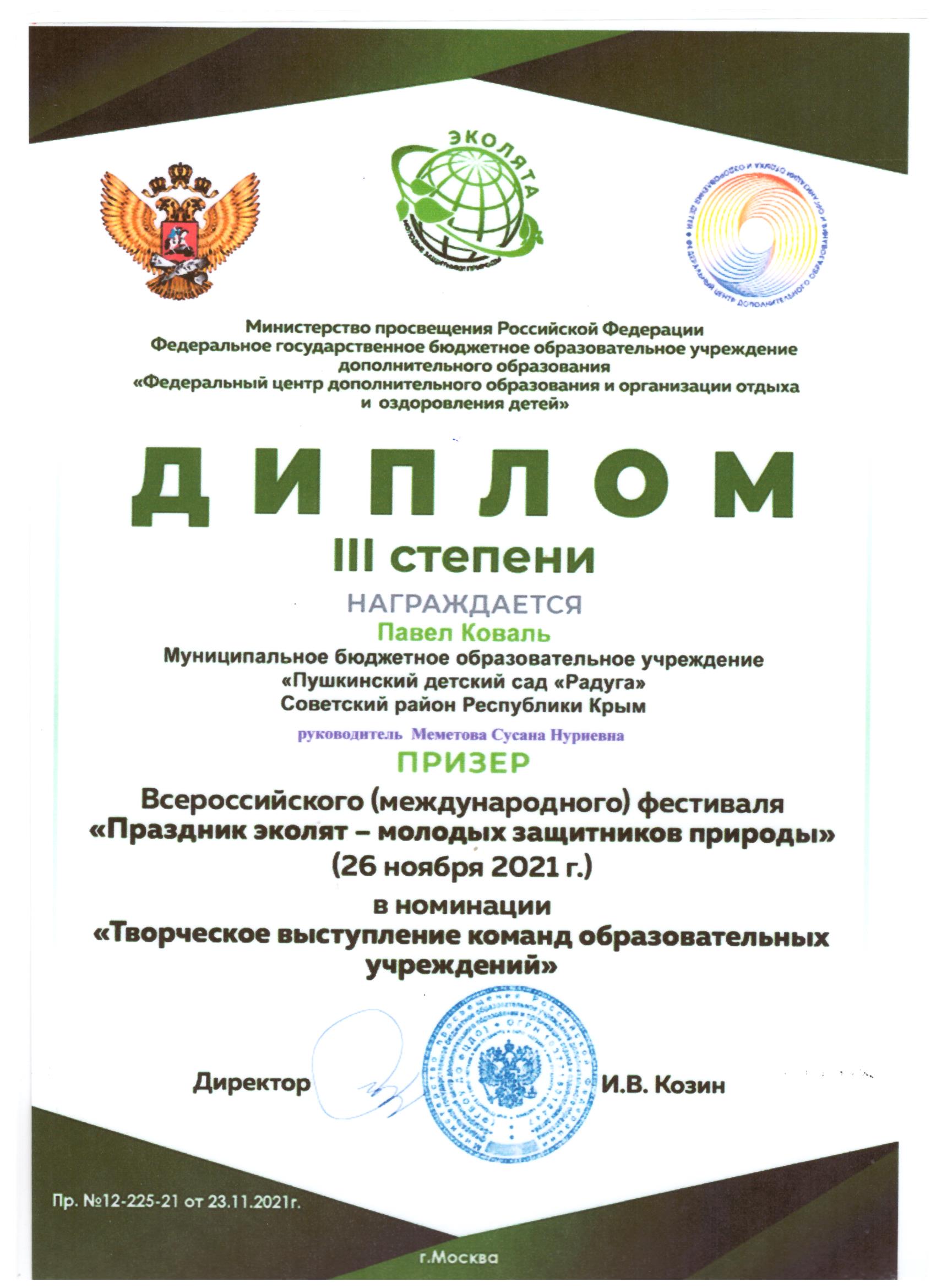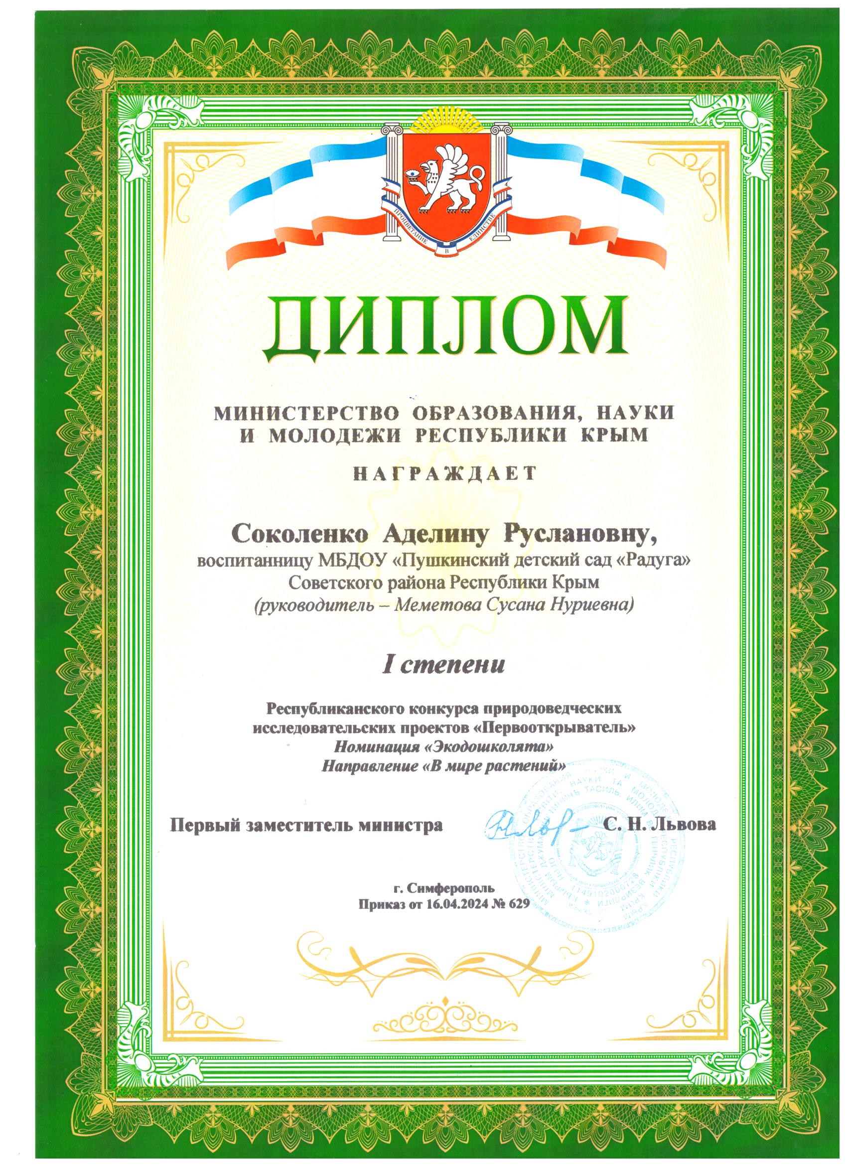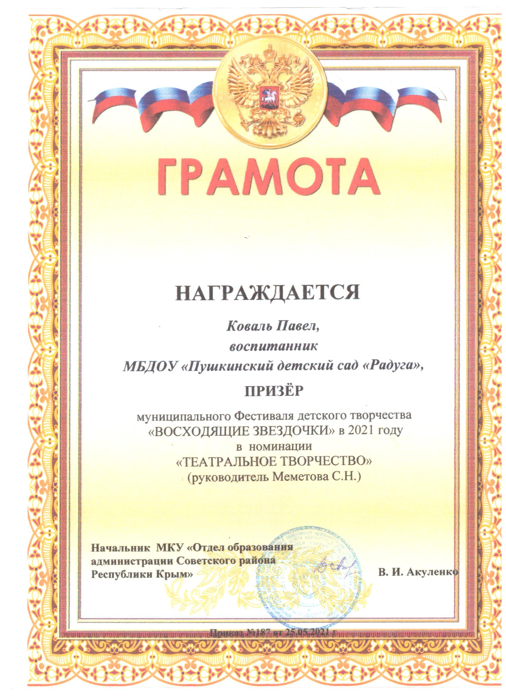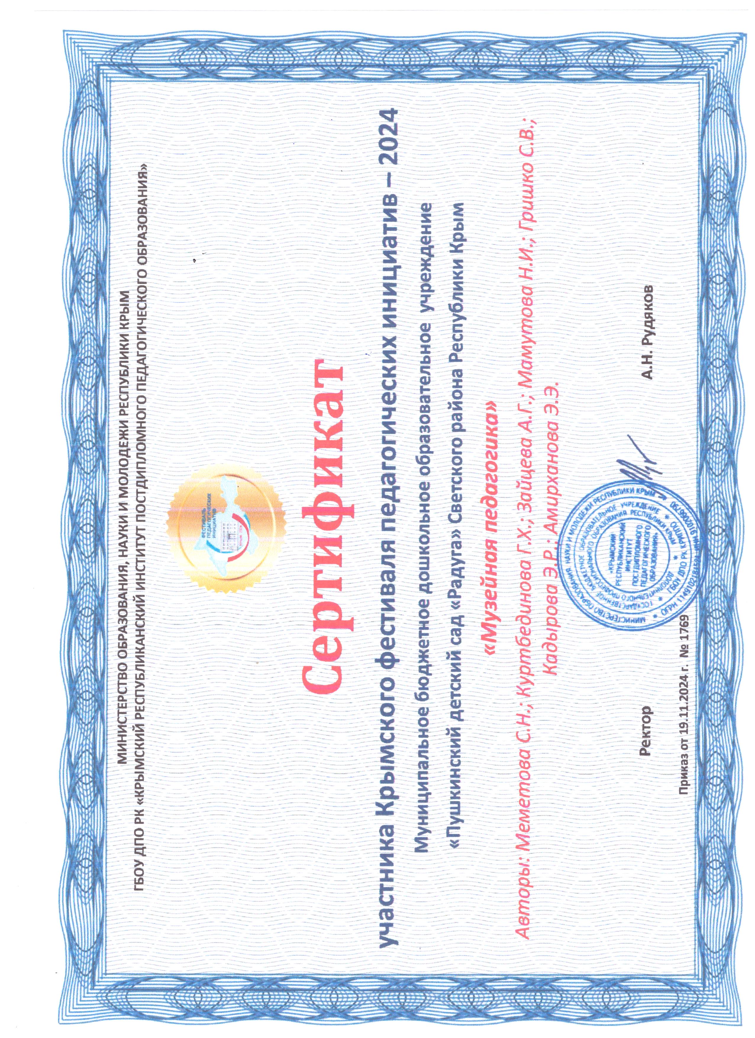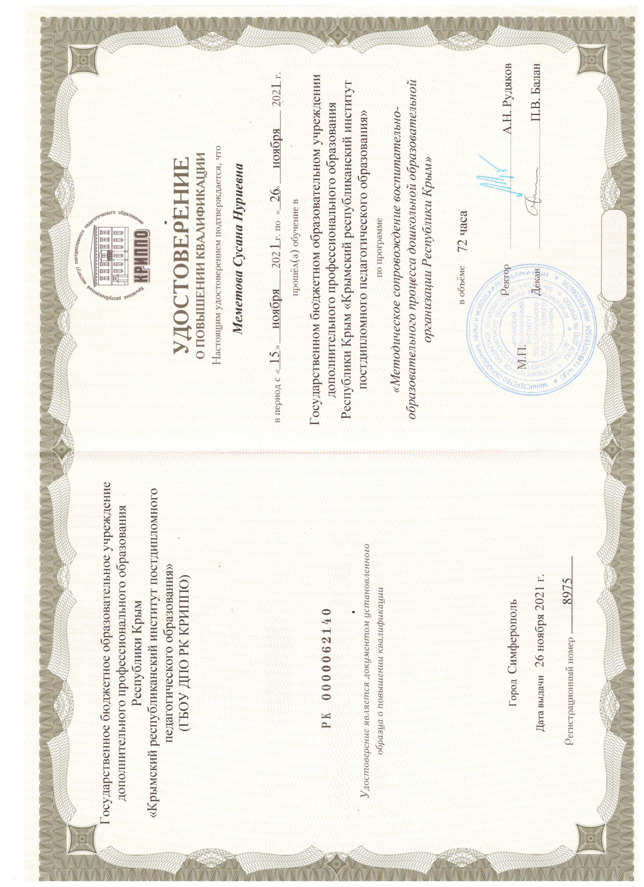 -Автономная некоммерческая организация дополнительного профессионального образования «Севастопольский учебный центр безопасности и морской подготовки» по программе «Старший воспитатель. Организация и методическое сопровождение дошкольного образования в соответствии с требованиями ФГОС ДО» 2021г.