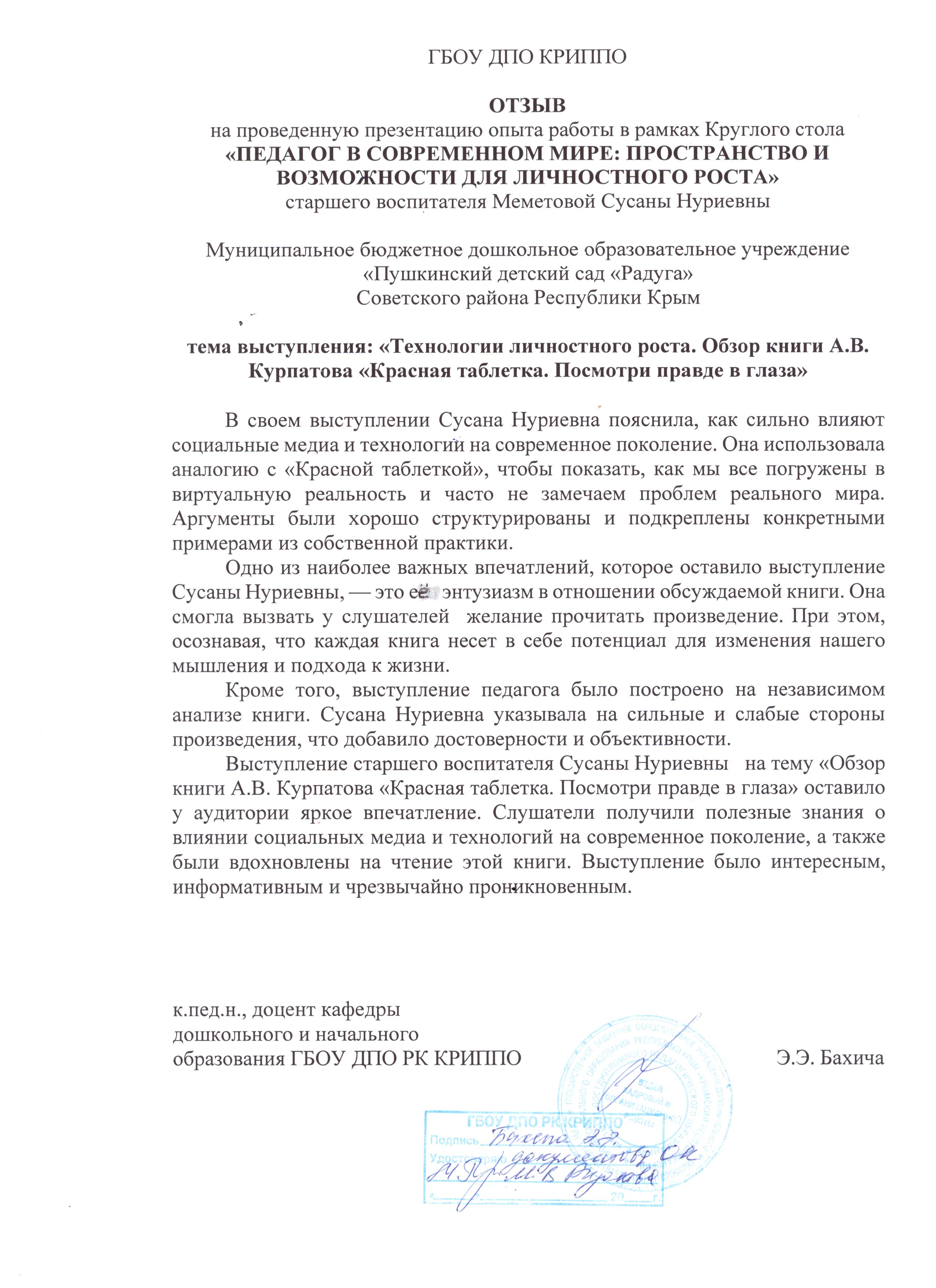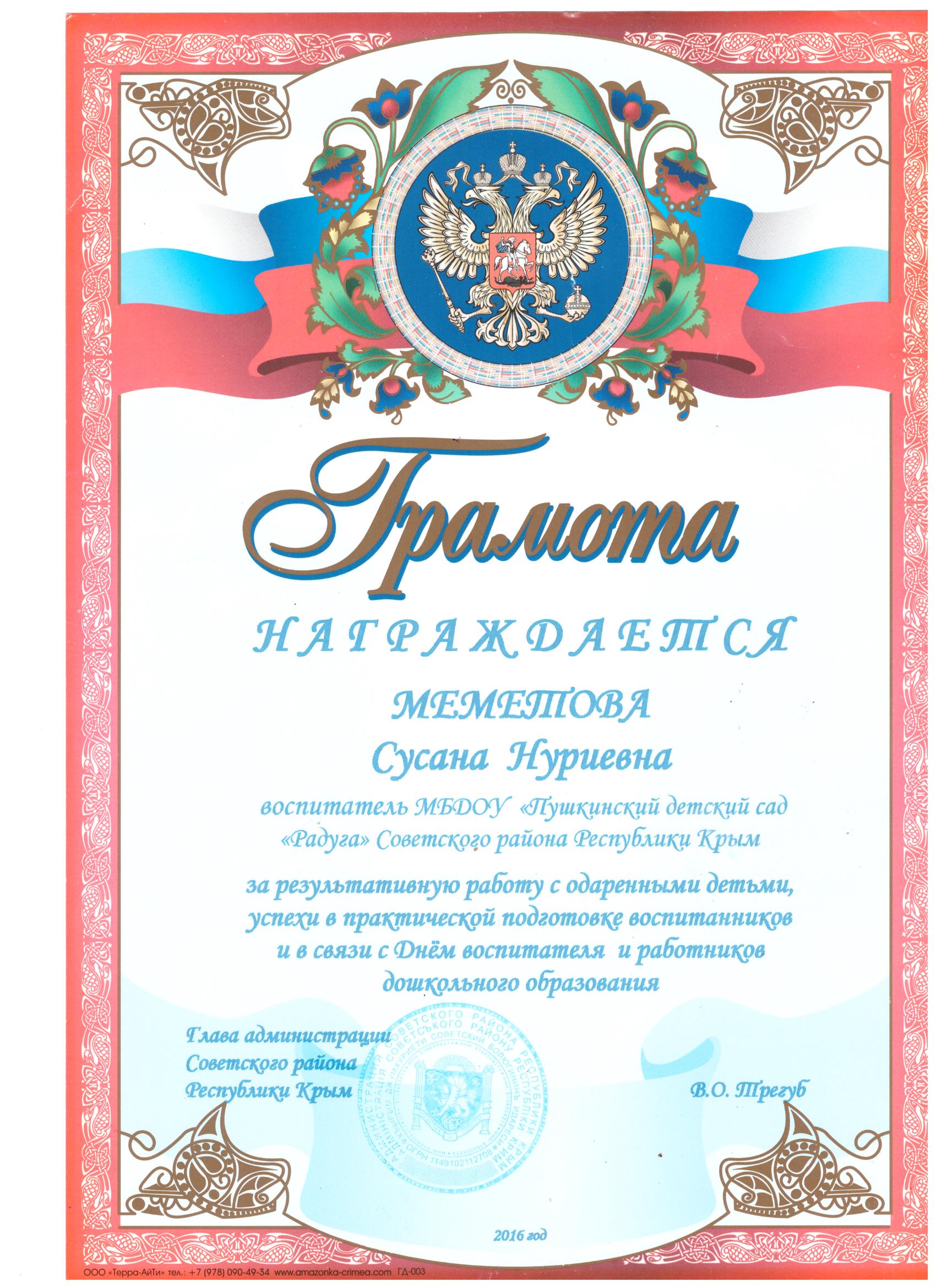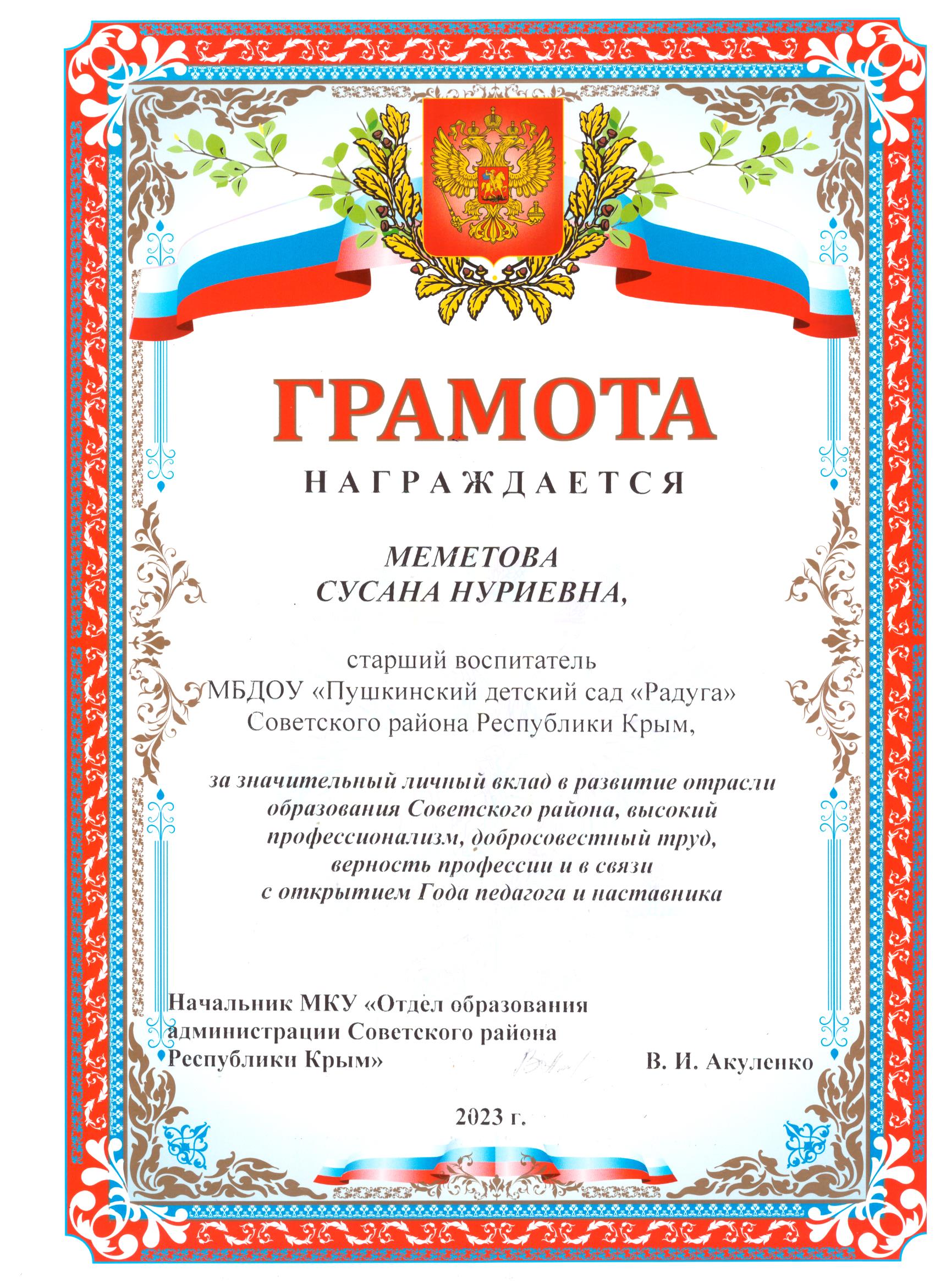 Меметова Сусана Нуриевна, 1969 года рождения – старший воспитатель МБДОУ «Пушкинский детский сад «Радуга» Советского района Республики Крым, в 1993 году окончила Андижанский государственный педагогический институт языков, полученная специальность и квалификация - «Русский язык и литература» и квалификация – учитель русского языка и литературы.на Нуриевна.