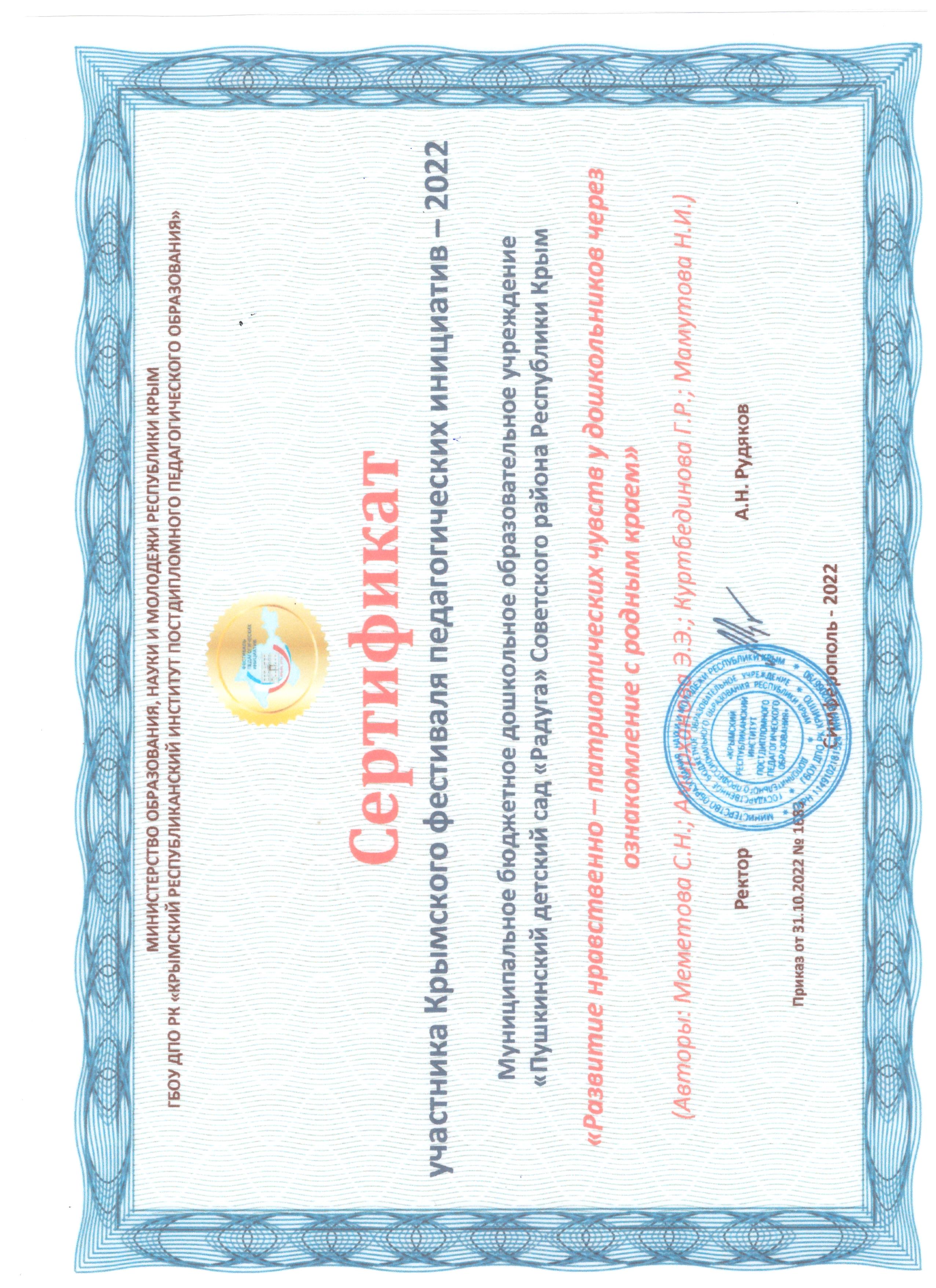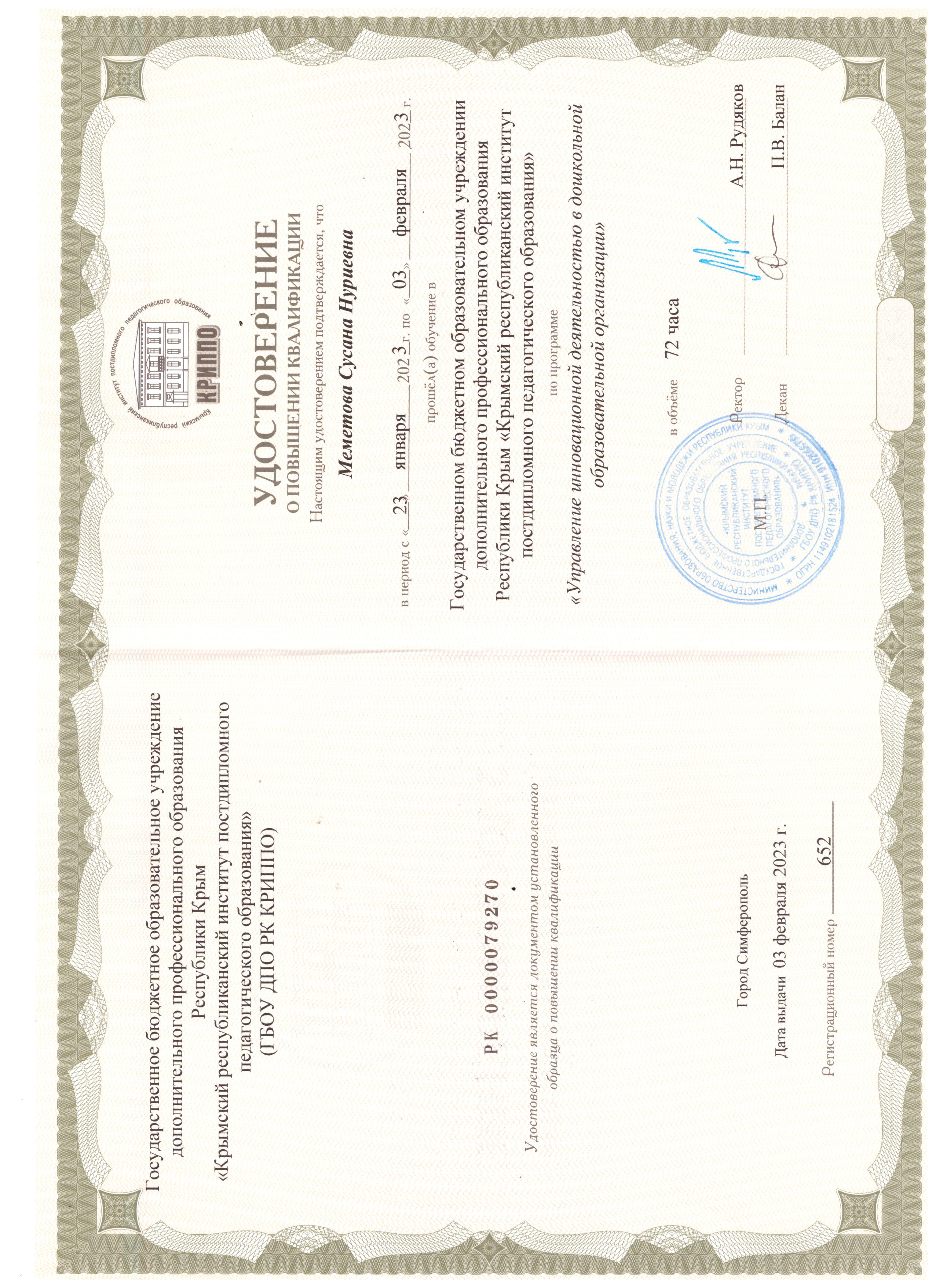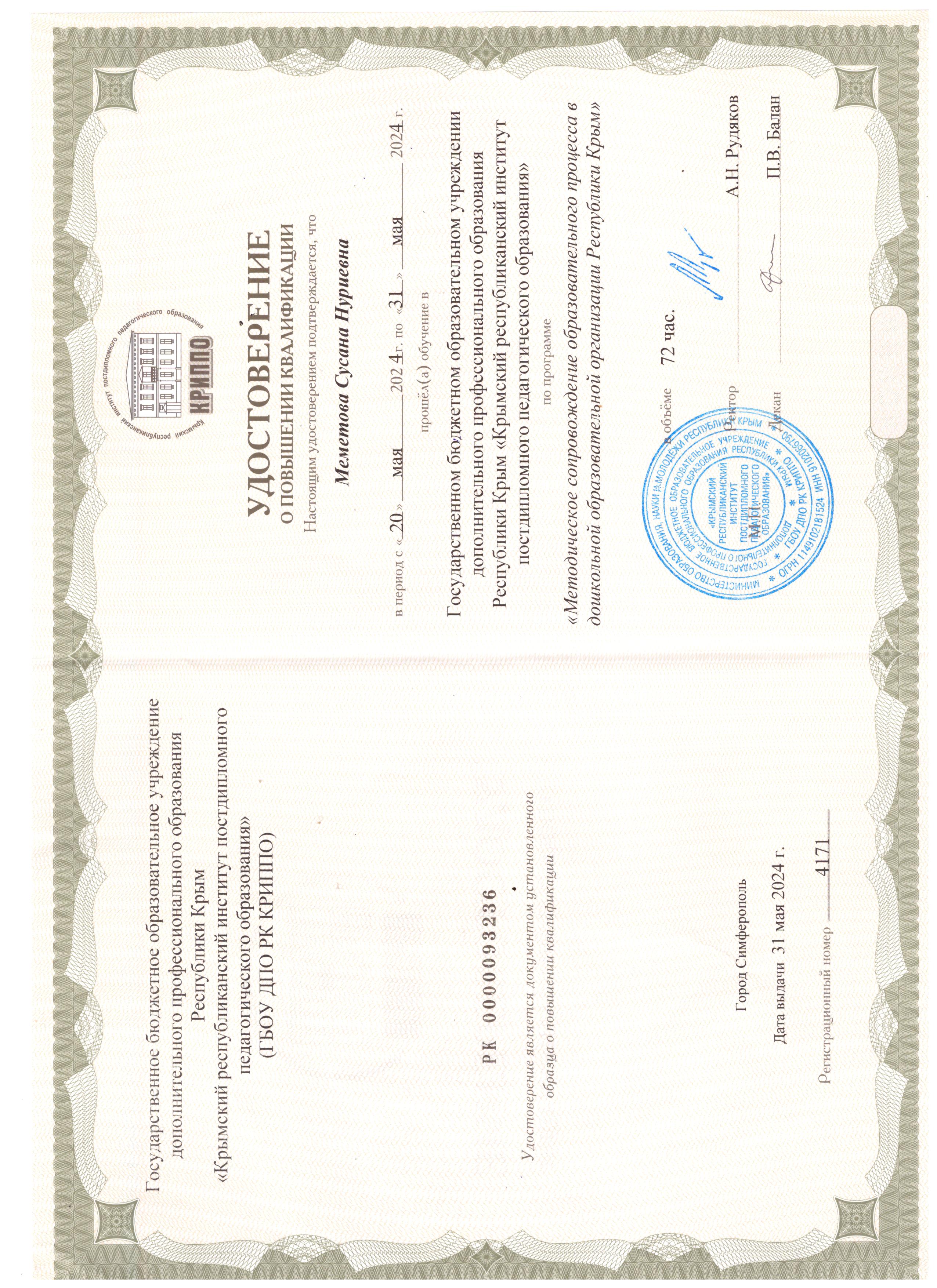 Меметова Сусана Нуриевна, 1969 года рождения – старший воспитатель МБДОУ «Пушкинский детский сад «Радуга» Советского района Республики Крым, в 1993 году окончила Андижанский государственный педагогический институт языков, полученная специальность и квалификация - «Русский язык и литература» и квалификация – учитель русского языка и литературы.на Нуриевна.